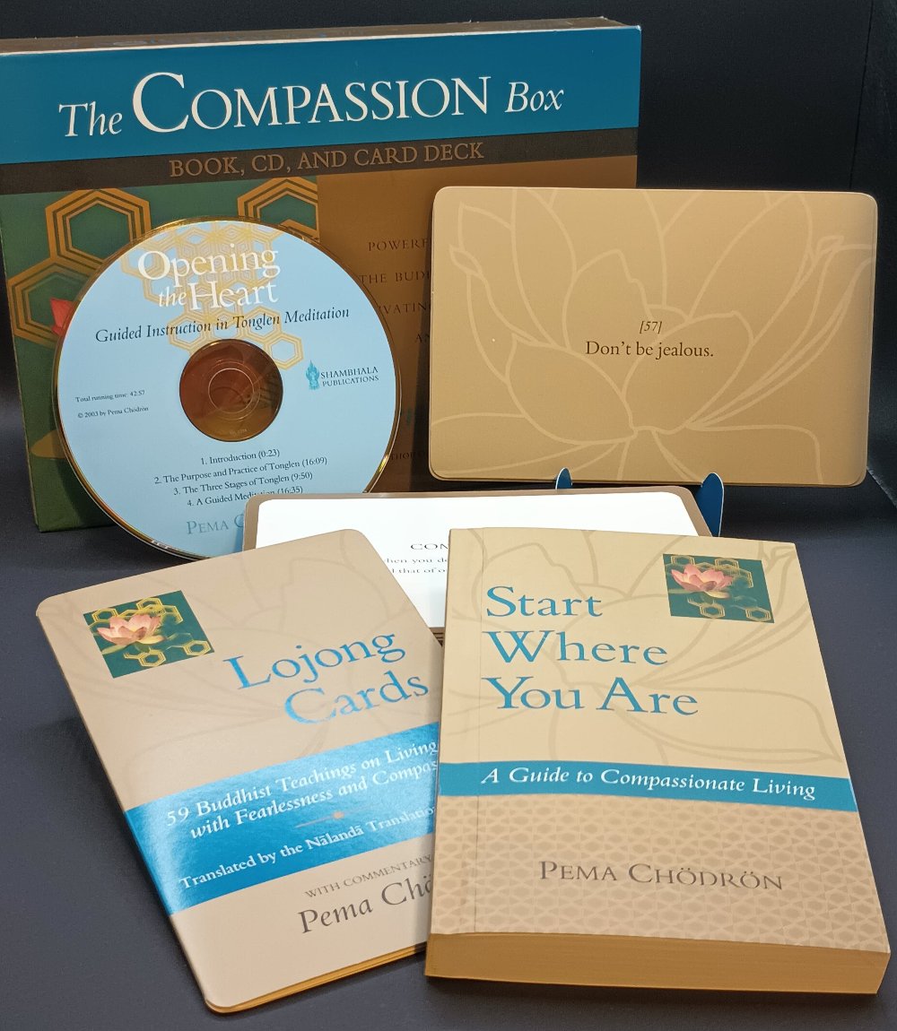 - 59 two-color cards, with a Buddhist slogan on one side and original commentary by Pema Chödrön on the other;