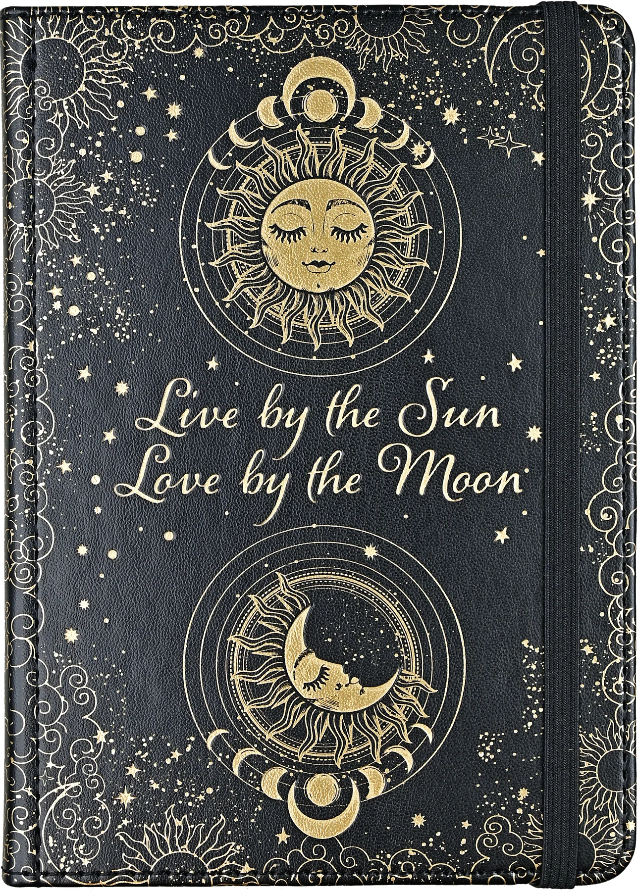 This sophisticated notebook boasts a vegan leather cover, fancy stitching, and a sun and moon design with the phrase "Live by the Sun, Love by the Moon" in glistening gold foil!