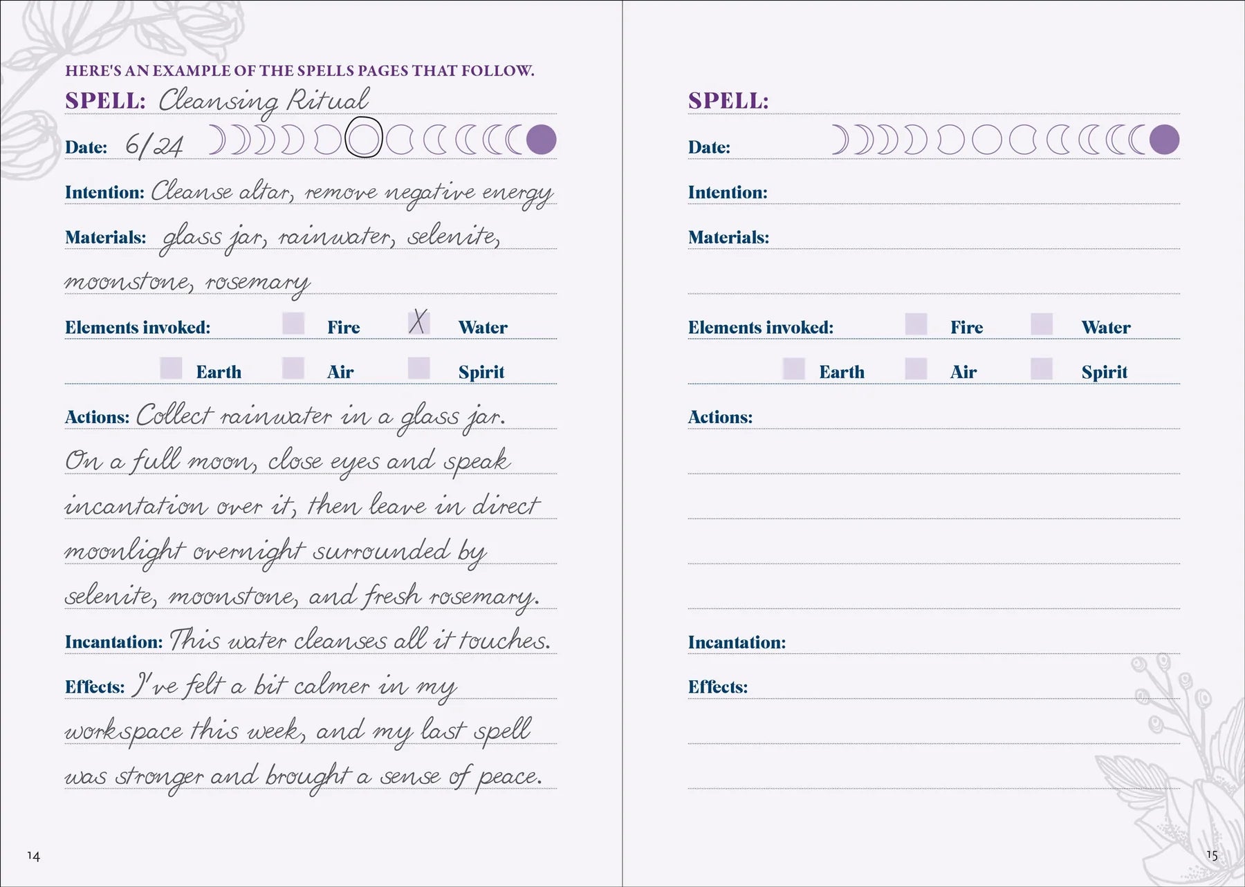 Unlock your magick, aid a bud, or banish something wicked with a bespoke book of incantations tailor-made for your wishes. Log your magical musings with this simple & interactive record. Track spell goals, components, consequences, and more. Incl'd: A brief briefing on spellcraft & recs for magical essentials. Use it to access your abilities and direct your energy for the better.