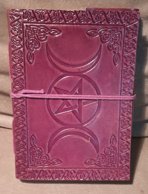 The Triple Moon Pentagram leatherbound journal has a beautiful handmade design. It has 200 blank (unlined) pages to provides plenty of space for you to record your thoughts, ideas, sketches, and artwork. While the leather covers are not thick, the pages are sewn in with leather wrappings, covered with an outer flap, and kept shut with a wrap-around leather chord.