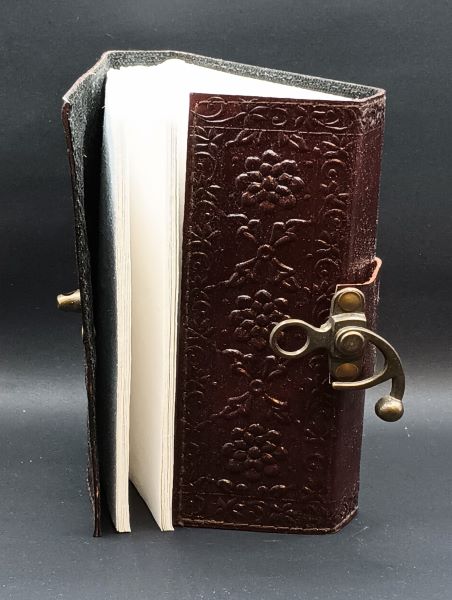 The Pentagram leatherbound journal has a beautiful handmade design. Its 200 blank (unlined) pages provide plenty of space for your thoughts, ideas, sketches, and artwork. While the leather covers are not thick, the pages are sewn in with leather wrappings, covered with an outer flap, and secured with a hasp.